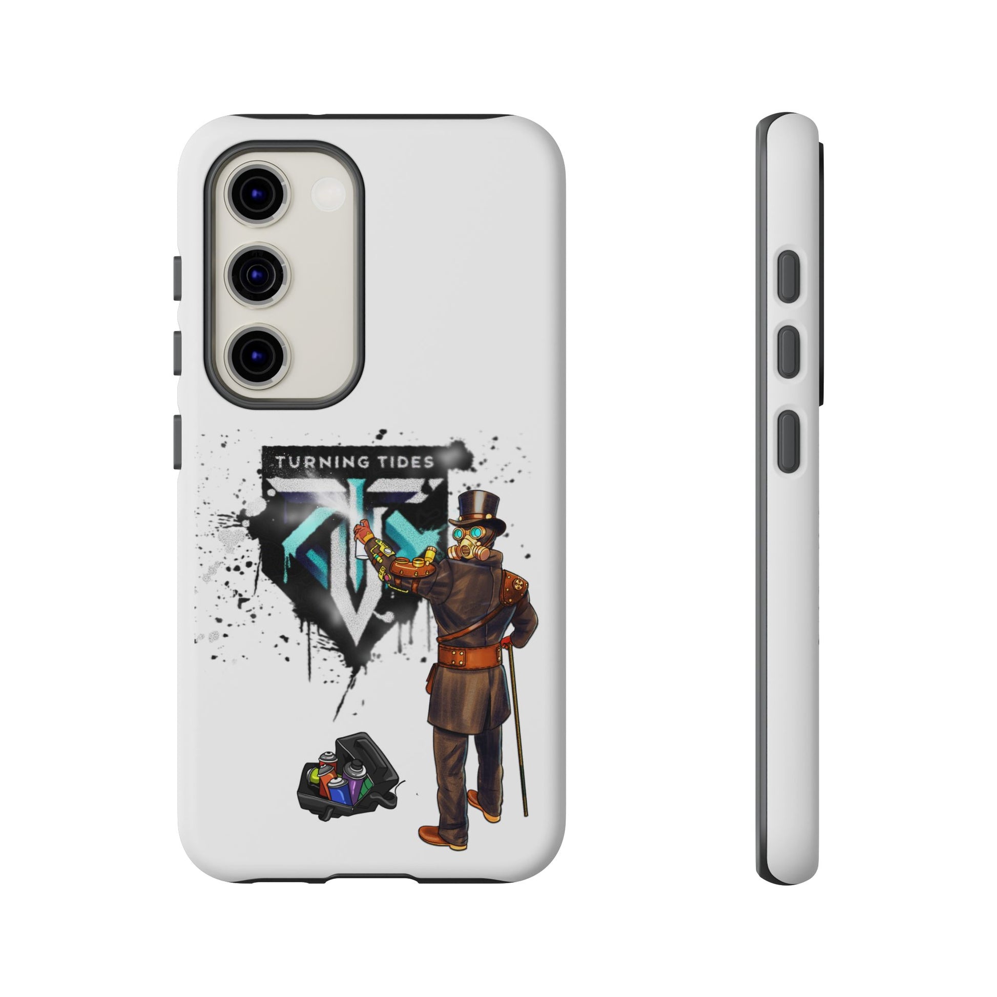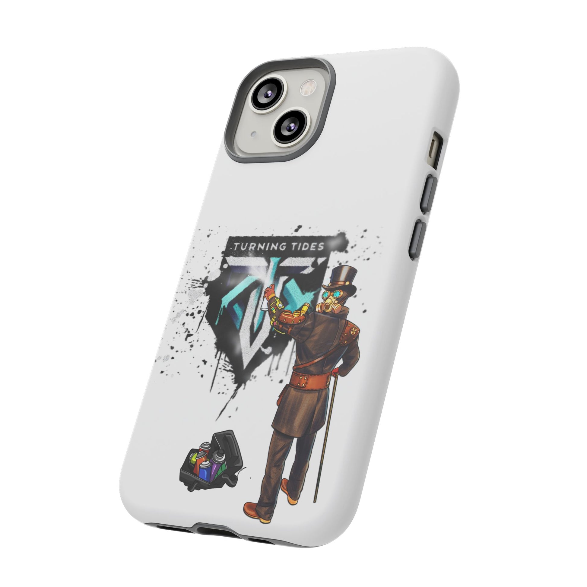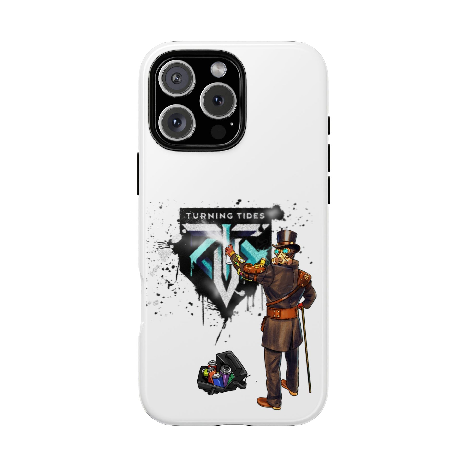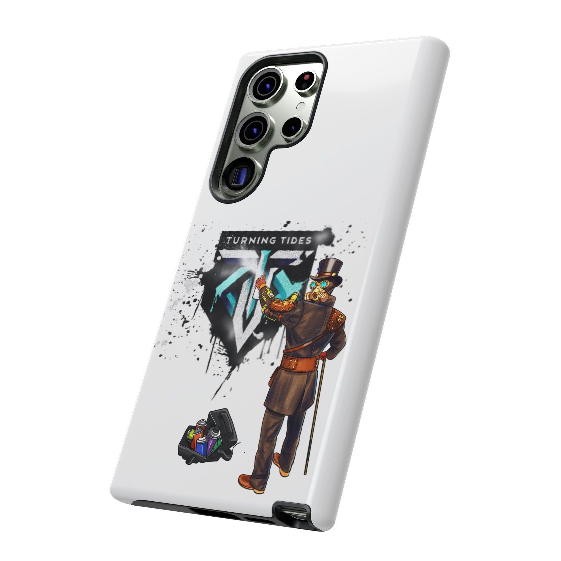 Tough phone case with steampunk character spray painting the Turning Tides logo. This phone case exudes a rugged and artistic vibe, perfect for those who appreciate unique and durable accessories. Ideal for steampunk enthusiasts and those looking to protect their phone in style. Relevant for everyday use and gifting during birthdays, Christmas, and other special occasions.