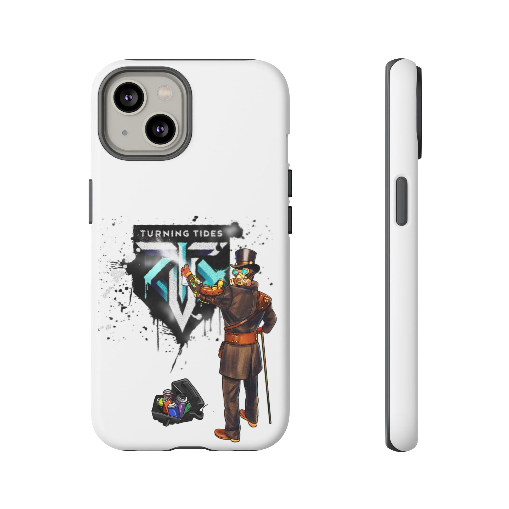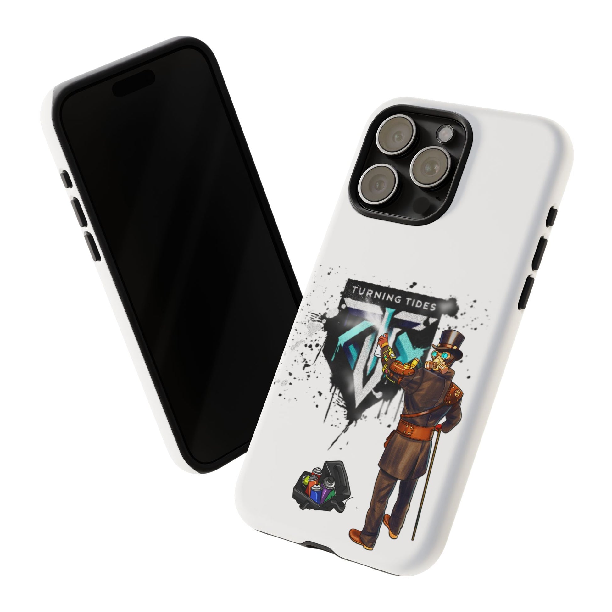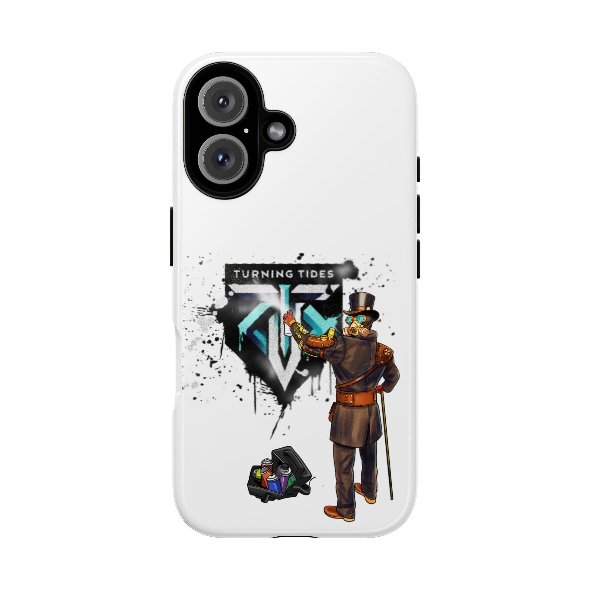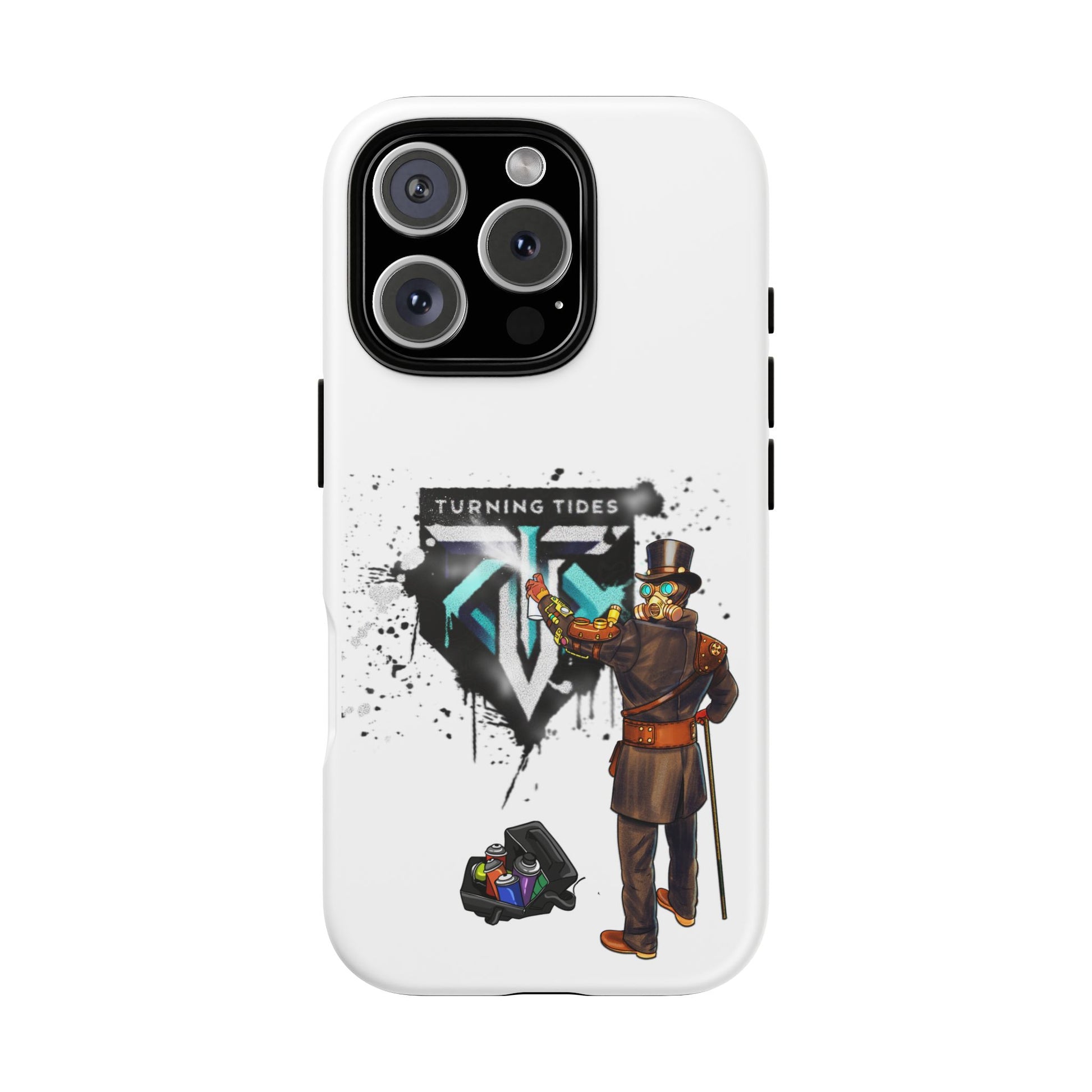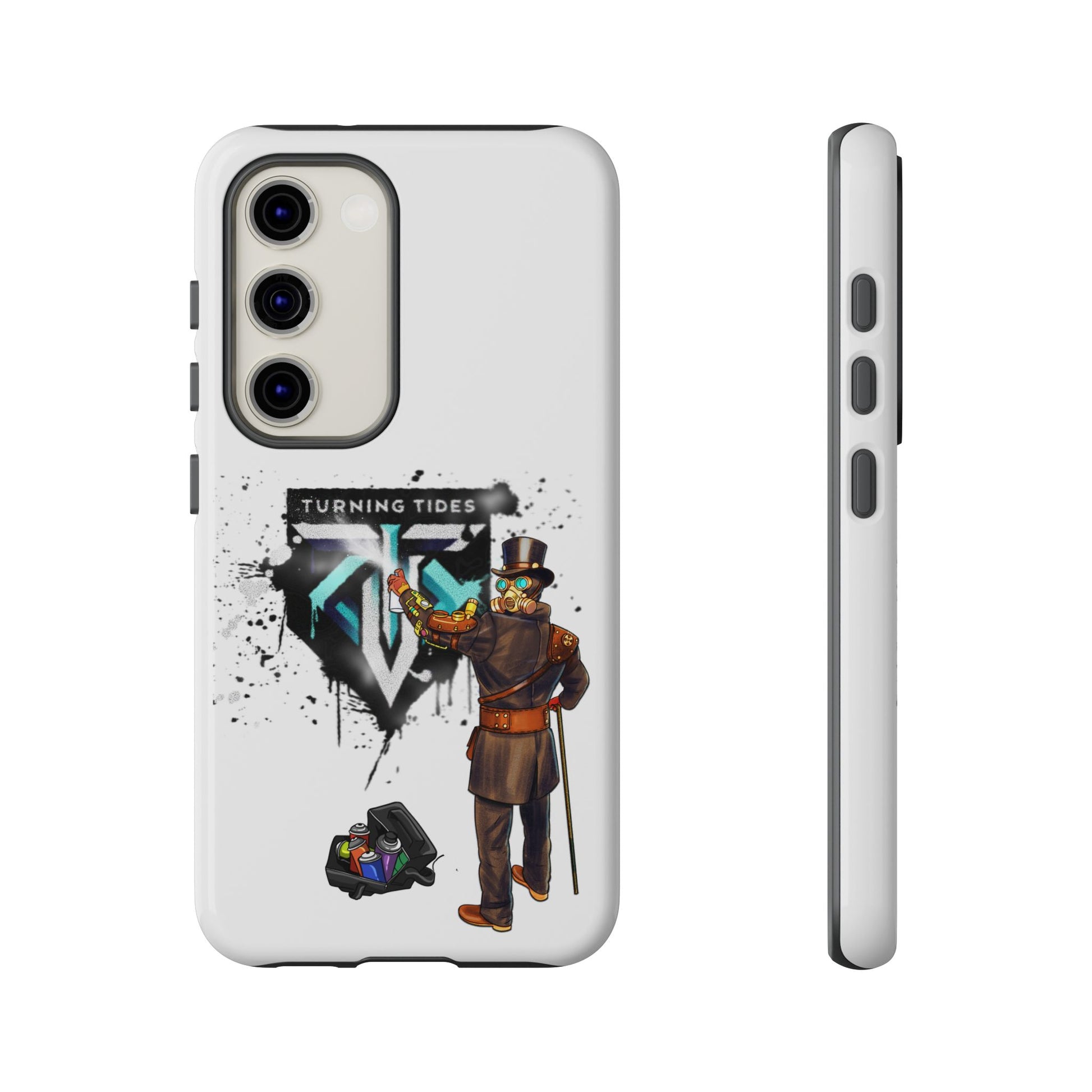 Tough phone case with steampunk character spray painting the Turning Tides logo. This phone case exudes a rugged and artistic vibe, perfect for those who appreciate unique and durable accessories. Ideal for steampunk enthusiasts and those looking to protect their phone in style. Relevant for everyday use and gifting during birthdays, Christmas, and other special occasions.